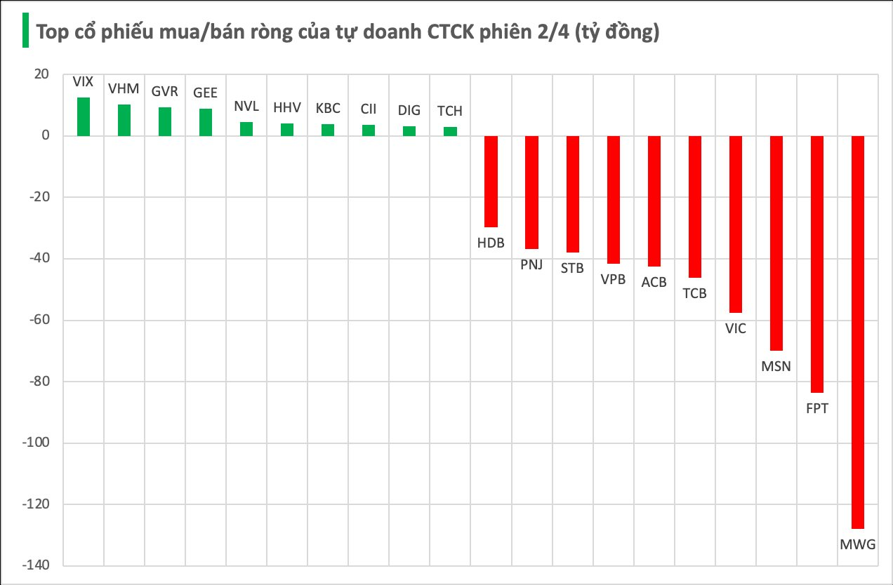 Cụ thể, VIX và VHM được mua ròng với giá trị lần lượt là 13 tỷ và 10 tỷ đồng. Theo sau là GVR (9 tỷ), GEE (9 tỷ), NVL (4 tỷ), HHV (4 tỷ), KBC (4 tỷ), CII (4 tỷ), DIG (3 tỷ) và TCH (3 tỷ đồng) đều được tự doanh CTCK mua nhẹ.