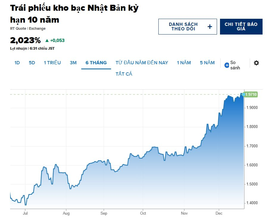 Sau quyết định này, lợi suất trái phiếu chính phủ Nhật Bản (JGB) kỳ hạn 10 năm tăng khoảng 5 điểm cơ bản lên 2,019%, trong khi lợi suất JGB kỳ hạn 20 năm tăng 3 điểm cơ bản lên 2,975%, cả hai đều đạt mức cao nhất kể từ năm 1999.