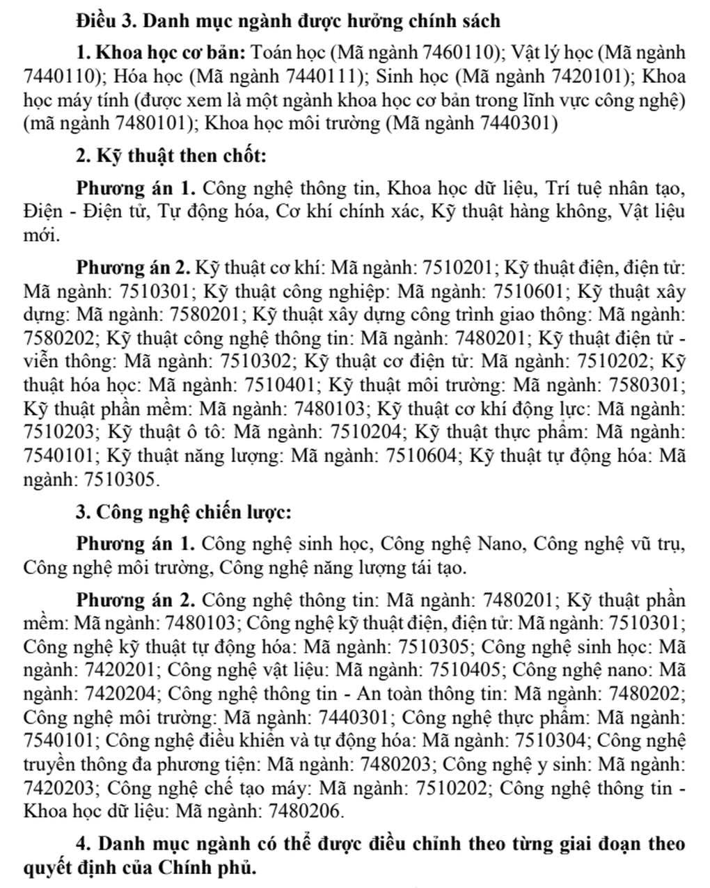 * Trong danh mục các ngành thuộc lĩnh vực khoa học cơ bản, kỹ thuật then chốt, công nghệ chiến lược, dự kiến được hưởng hỗ trợ. Ngành Công nghệ thông tin được đề xuất tại mục 2. Kỹ thuật then chốt và mục 3. Công nghệ chiến lược