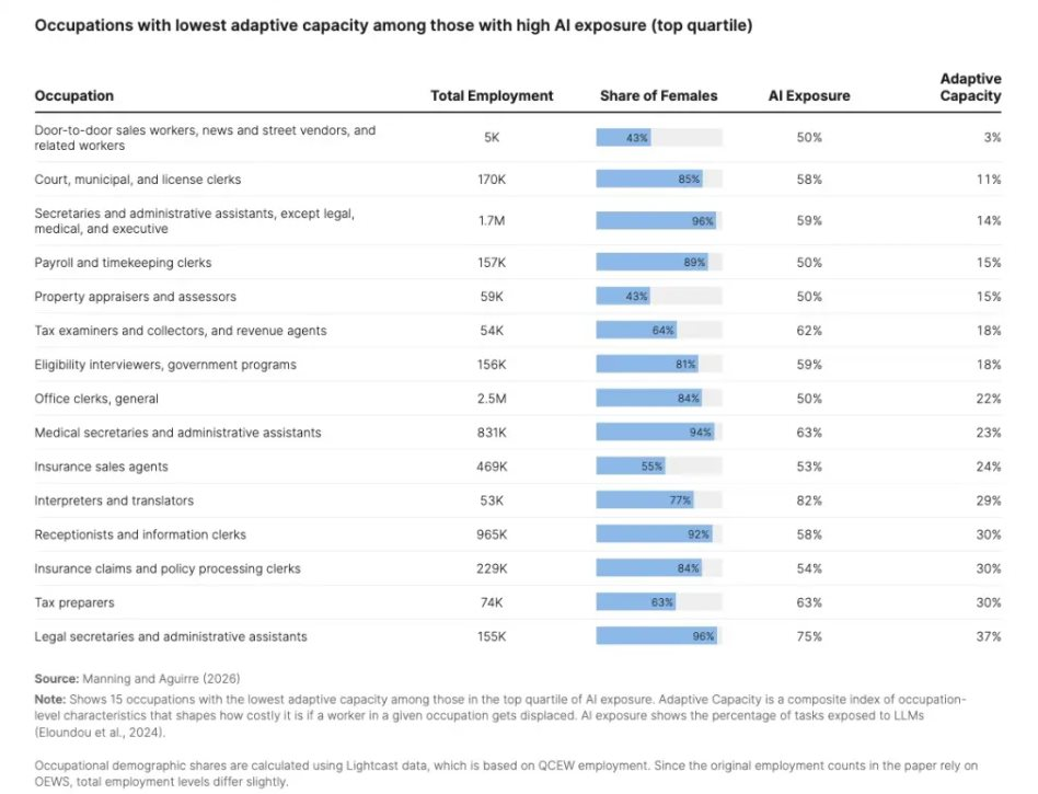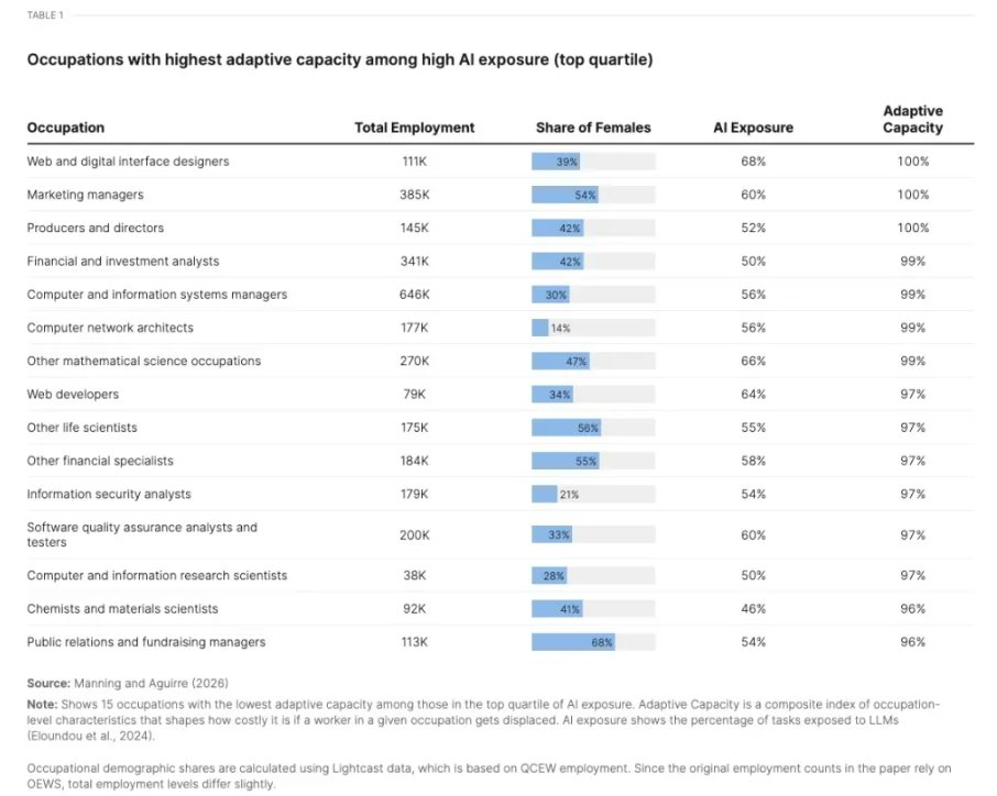 Kết quả cho thấy, trong số 37,1 triệu lao động tại Mỹ có nguy cơ mất việc làm cao do sự tiến bộ của AI, có khoảng 26,5 million người sở hữu "khả năng thích ứng trên mức trung bình". Điều này có nghĩa là họ có đủ kỹ năng, nguồn lực và vị thế để chuyển đổi sang một công việc mới nếu cần thiết.