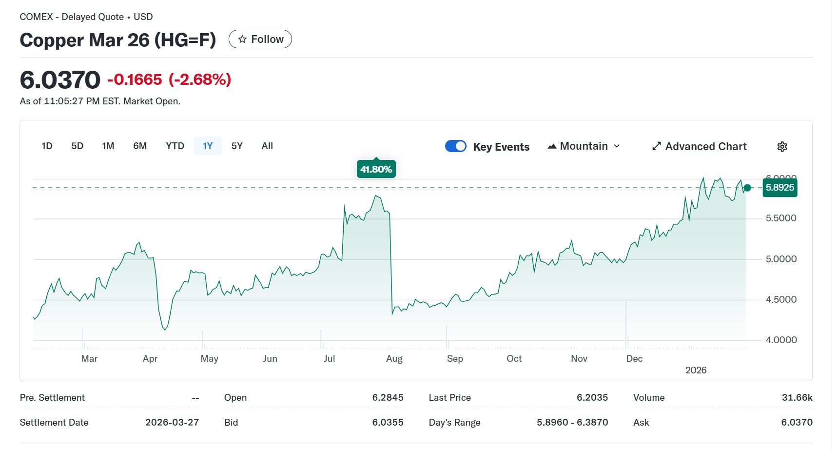 Kim loại đó chính là đồng. Giá đồng đã tăng hơn 40% trong năm 2025 và hiện đã tăng hơn 9% từ đầu năm đến nay.