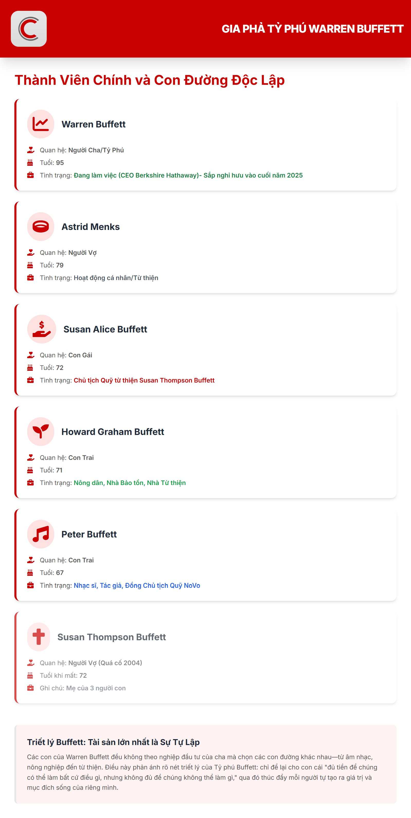 Hành động này, dù có vẻ khắc nghiệt đối với người ngoài, lại chính là biểu hiện cao nhất của phong cách giáo dục tự do và tự lập mà Warren Buffett theo đuổi. Thay vì cung cấp một lưới an toàn tài chính dễ dãi có thể dẫn đến sự trì trệ và phụ thuộc, Warren đã gửi gắm một thông điệp rõ ràng: "Cha tin tưởng con và con không cần sự giúp đỡ của cha."