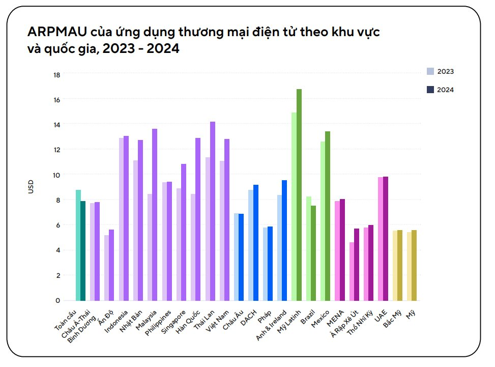 Thế nhưng, trái ngược hoàn toàn với đà giảm chung của thế giới, thị trường Việt Nam lại ghi nhận một sự bùng nổ về chất lượng dòng tiền. Chỉ số ARPMAU tại Việt Nam đã chạm mốc kỷ lục 12,7 USD. Điều này đồng nghĩa với việc trung bình mỗi người dùng ứng dụng mua sắm tại Việt Nam đang mang lại doanh thu cao gấp 1,6 lần so với mức trung bình của một người dùng trên thế giới.