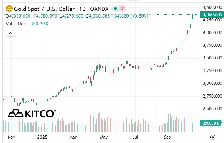 Trên thị trường quốc tế, giá vàng tiếp tục tăng dựng đứng khi nhu cầu trú ẩn an toàn và lực mua kỹ thuật đẩy giá lên những đỉnh cao mới.
