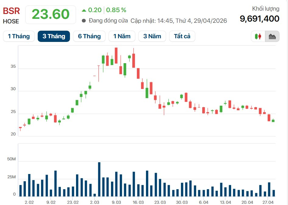 Trên thị trường chứng khoán, chốt phiên giao dịch ngày 29/4, thị giá cổ phiếu BSR đóng cửa ở mức 23.600 đồng/cổ phiếu với khối lượng giao dịch đạt 9.691.400 đơn vị.