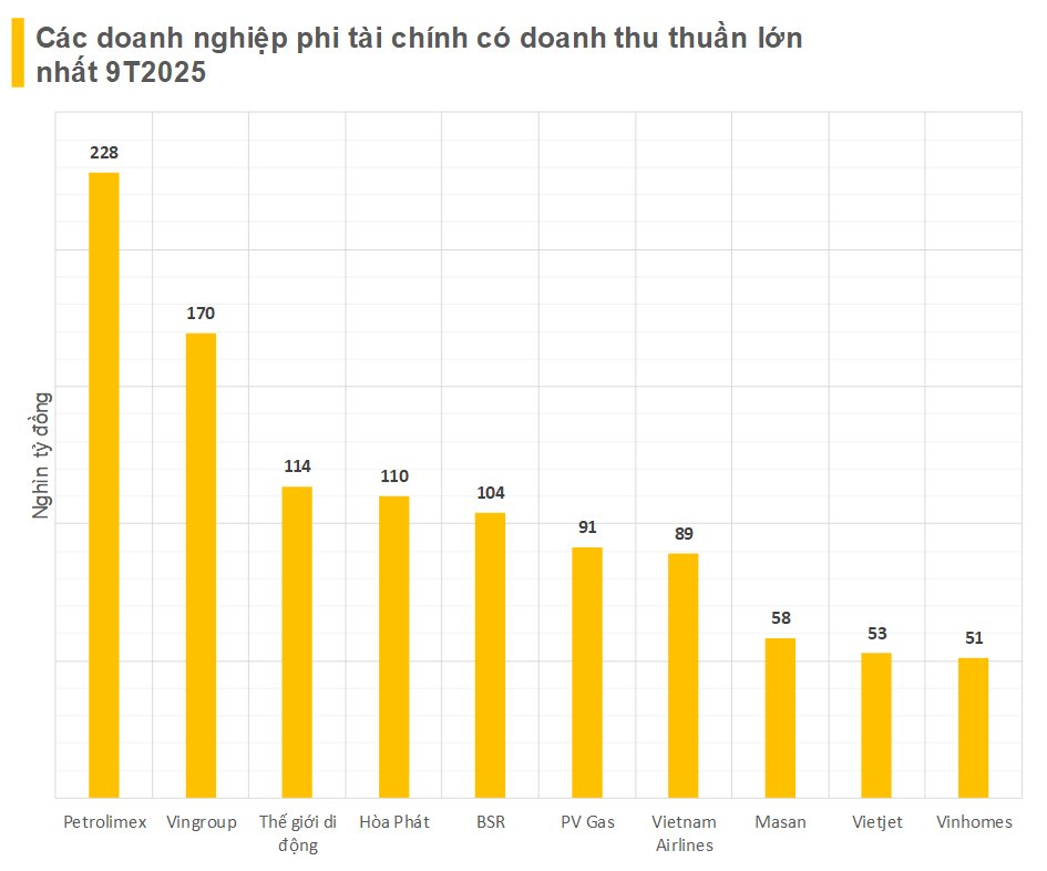 Trong top 10 doanh nghiệp phi tài chính có doanh thu thuần lớn nhất 9 tháng 2025 có tới 3 doanh nghiệp dầu khí (Petrolimex, PV Gas và BSR), 2 doanh nghiệp bất động sản (Vingroup, Vinhomes), 2 doanh nghiệp hàng không (Vietnam Airlines, Vietjet), 1 doanh nghiệp bán lẻ (Thế giới di động), 1 doanh nghiệp thép (Hòa Phát), 1 doanh nghiệp F&B (Masan).