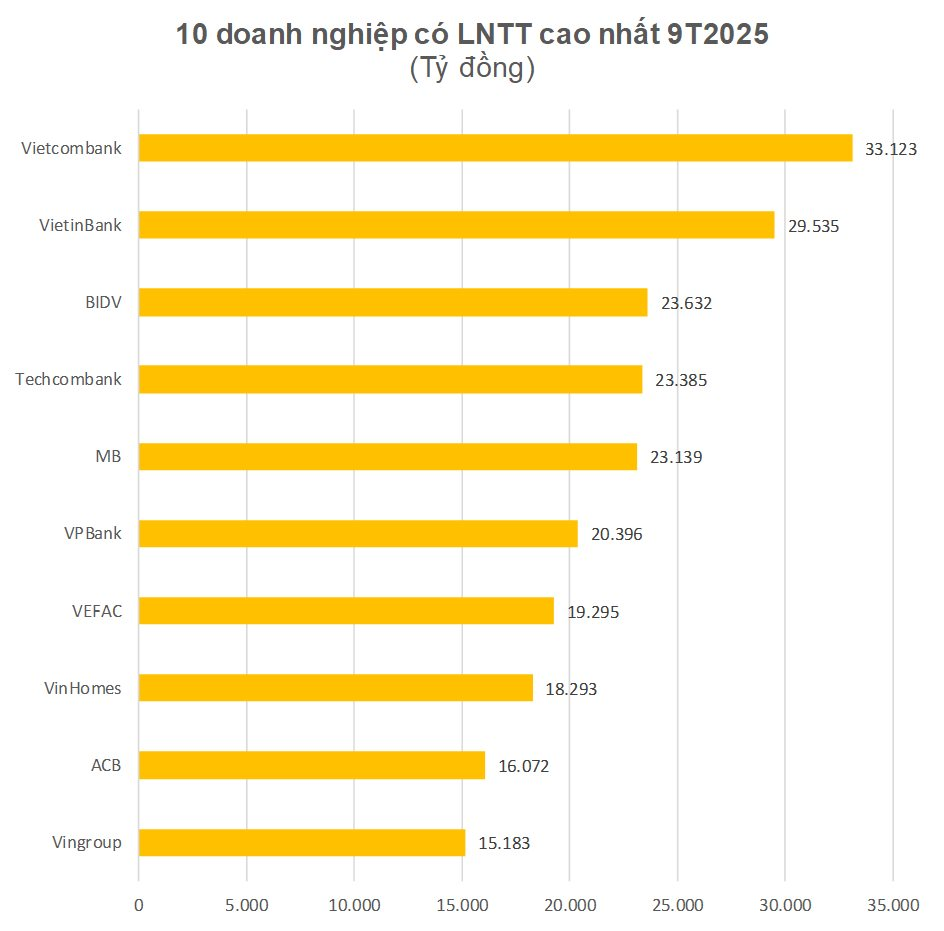 Về phần lợi nhuận trước thuế, có 17 doanh nghiệp có mức lợi nhuận trước thuế trong 9 tháng đầu năm 2025 trên 10.000 tỷ đồng. Trong đó, 10 doanh nghiệp đứng đầu có mức lãi trên 15.000 tỷ đồng.
