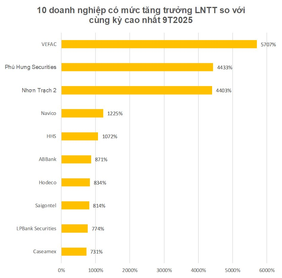 Có 5 doanh nghiệp có mức tăng trưởng trong 9 tháng đầu năm 2025 trên 1.000%, trừ VEFAC ra còn có Chứng khoán Phú Hưng (4.433%), Nhơn Trạch 2 (4.403%), Navico (1.225%) và HHS (1.072%).