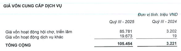 Công ty Cổ phần Trung tâm Hội chợ Triển lãm Việt Nam (VEF) vừa công bố báo cáo tài chính quý 3/2025 ghi nhận doanh thu thuần quý 3 đạt 46 tỷ đồng, cao gấp 11,5 lần so với 4 tỷ đồng của quý 3/2024.