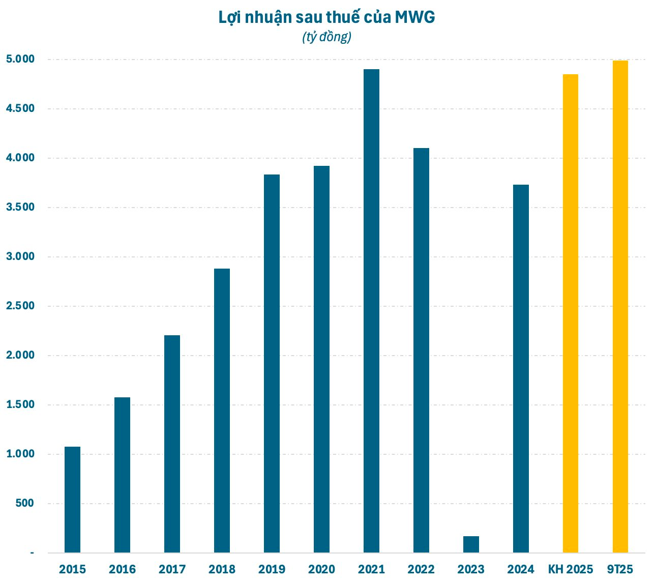 Trong báo cáo mới đây, Agriseco dự phóng lợi nhuận sau thuế của MWG có thể đạt hơn 6.800 tỷ đồng trong năm 2025, tăng 83% so với cùng kỳ 2024. Theo bộ phận phân tích này, tốc độ tăng trưởng lợi nhuận của MWG cao hơn doanh thu nhờ cải thiện hiệu quả hoạt động, tiết giảm nhiều loại chi phí.