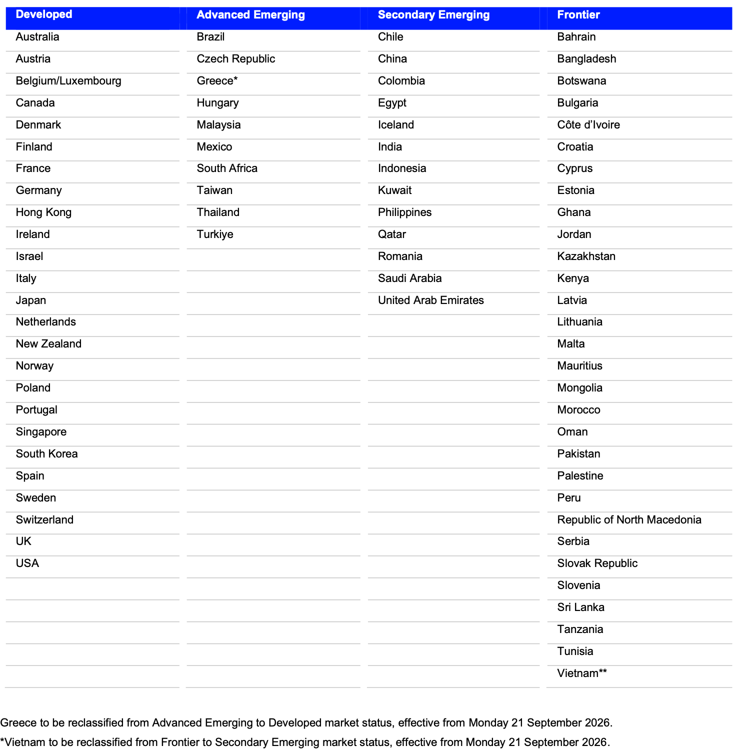 Hội đồng quản trị chỉ số FTSE Russell xác nhận rằng họ hài lòng với tiến độ đạt được trong việc triển khai mô hình môi giới toàn cầu, điều cần thiết để hỗ trợ mô phỏng chỉ số. Và do đó, Việt Nam vẫn được lên kế hoạch thực hiện từ trạng thái thị trường cận biên sang thị trường mới nổi thứ cấp, có hiệu lực từ thứ Hai ngày 21/9/2026.