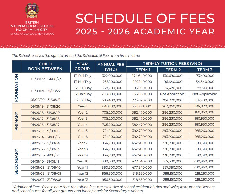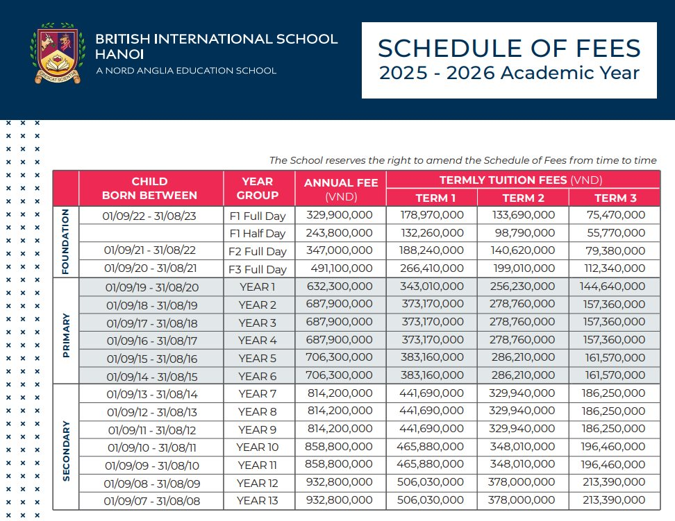Là một thành viên thuộc hệ thống giáo dục Nord Anglia, học phí trường quốc tế Anh – BIS tại Hà Nội và TP.HCM ở mức cao. Tại Hà Nội (năm học 2023-2024), mức phí dao động từ 243,8 triệu đồng (mẫu giáo nửa ngày) đến 932,8 triệu đồng/năm (THPT). Tại TP. HCM (2024-2025), con số cao hơn: từ 238,1 triệu đến 910,7 triệu đồng/năm, chưa kể phí bổ sung như xe đưa đón, bữa ăn hay chuyến dã ngoại.