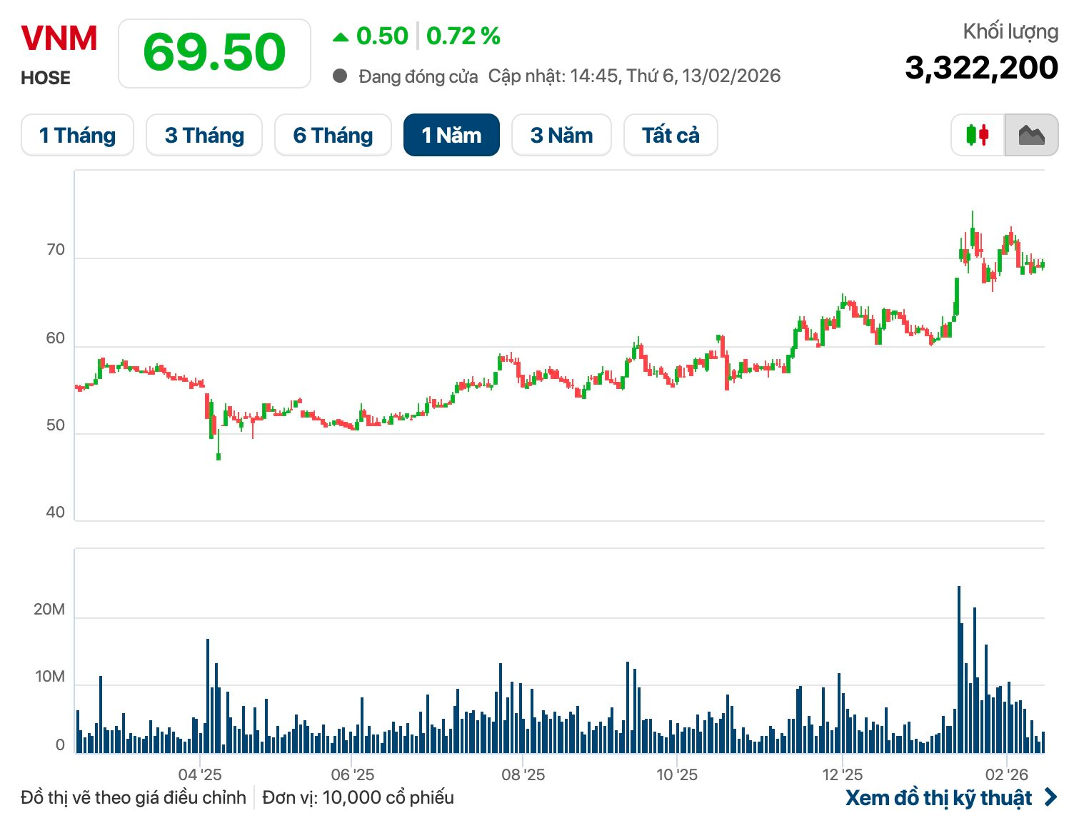 Phiên giao dịch cuối cùng của năm Ất Tỵ 2025, cổ phiếu VNM có giá là 69.500 đồng/cp, tăng 16% so với 5/1/2026.