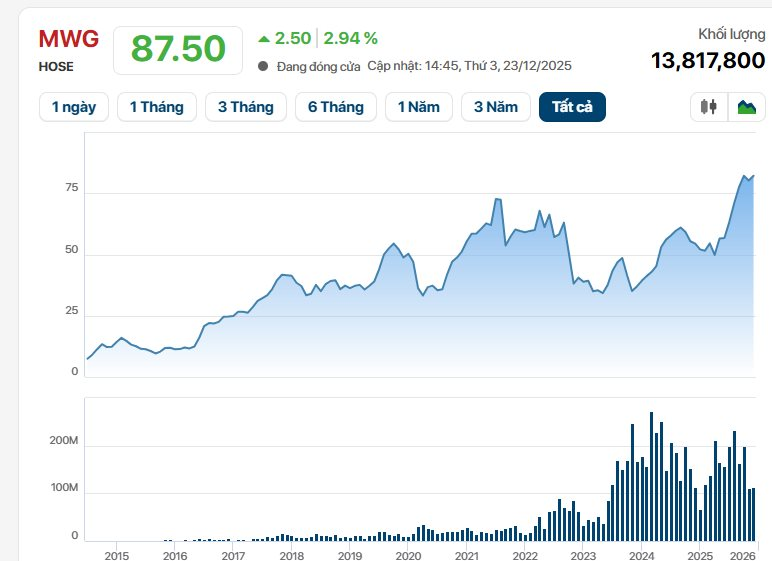 Tiếp đà tăng bốc của phiên trước, sắc xanh ngập tràn trên thị trường chứng khoán ngày 23/12. Trong đó, cổ đông Thế giới Di động (MWG) đón tin vui khi thị giá cổ phiếu bứt phá để thiết lập mức đỉnh cao mới.