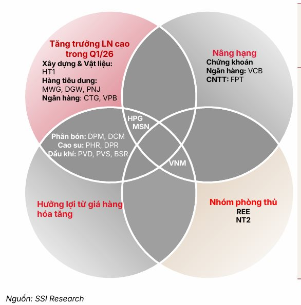 Khối phân tích gọi tên HPG với kỳ vọng mức tăng trưởng lợi nhuận 35,8% trong năm 2026 nhờ dự án Dung Quất 2 đi vào vận hành. Tương tự, MSN được dự phóng lợi nhuận tăng 63,4% nhờ chuỗi siêu thị Winmart hưởng lợi từ chính sách thuế mới và giá vonfram neo cao.