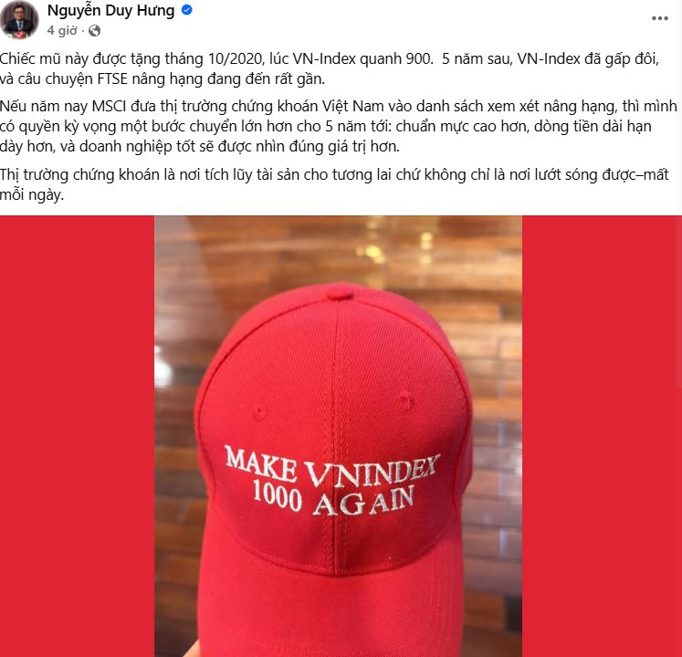 Hình ảnh chiếc mũ đỏ với thông điệp hài hước nhưng đầy ẩn ý đã thu hút sự quan tâm của cộng đồng nhà đầu tư. Nếu như năm 2020, mục tiêu “1000 điểm” mang tính biểu tượng cho sự hồi phục sau giai đoạn khó khăn, thì đến nay, câu chuyện không còn dừng ở một cột mốc điểm số cụ thể.
