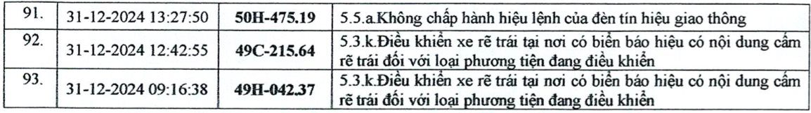 Danh sách bao gồm 523 phương tiện, với các hành vi vi phạm phổ biến là: “Điều khiển xe chạy quá tốc độ quy định”, “không chấp hành hiệu lệnh của đèn tín hiệu giao thông” và “đỗ xe ngược chiều lưu thông của làn đường”.