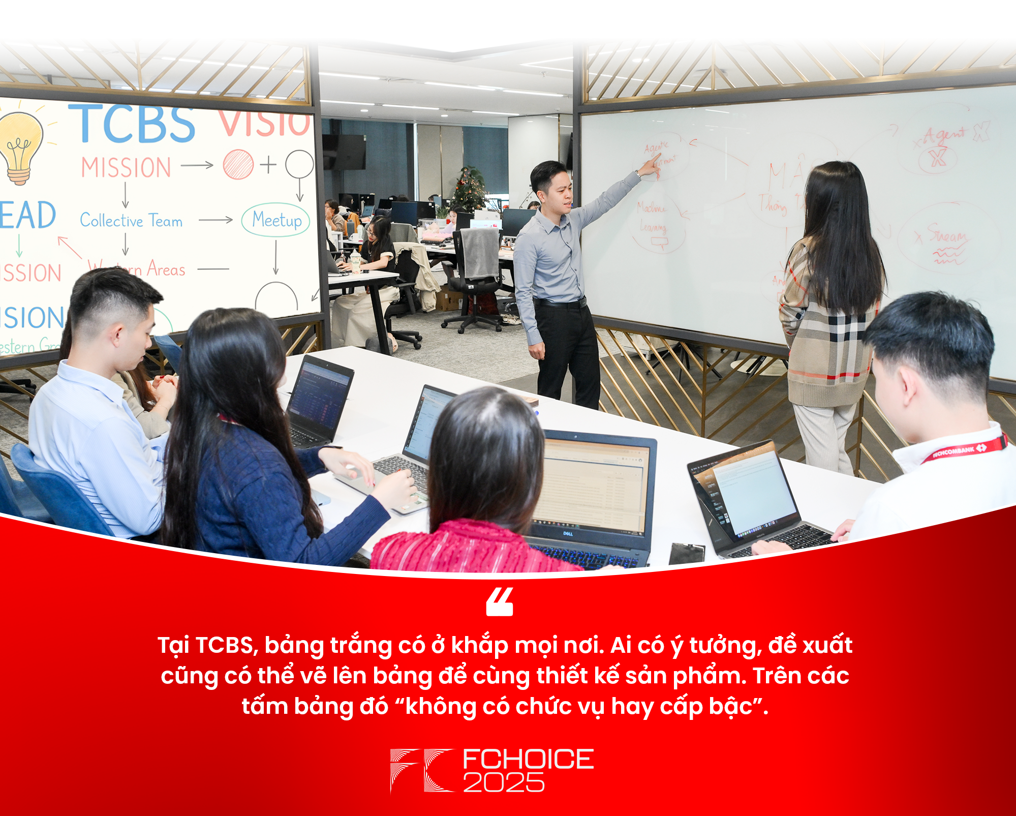 Tại TCBS, những tấm bảng trắng ở khắp mọi nơi trở thành một công cụ để thúc đẩy "better thinking" thay vì "better slides" - khuyến khích thảo luận mở, linh hoạt, minh bạch, và không sợ sai. Đây cũng là điểm tương đồng trong văn hoá làm việc tại TCBS với NVIDIA – tập đoàn công nghệ có giá trị nhất thế giới của Mỹ. Tại NVIDIA, Jensen Huang, Chủ tịch kiêm CEO xây dựng "văn hoá bảng trắng" để truyền tải triết lý về sự quyết liệt, tốc độ, minh bạch và luôn sẵn sàng thay đổi.
