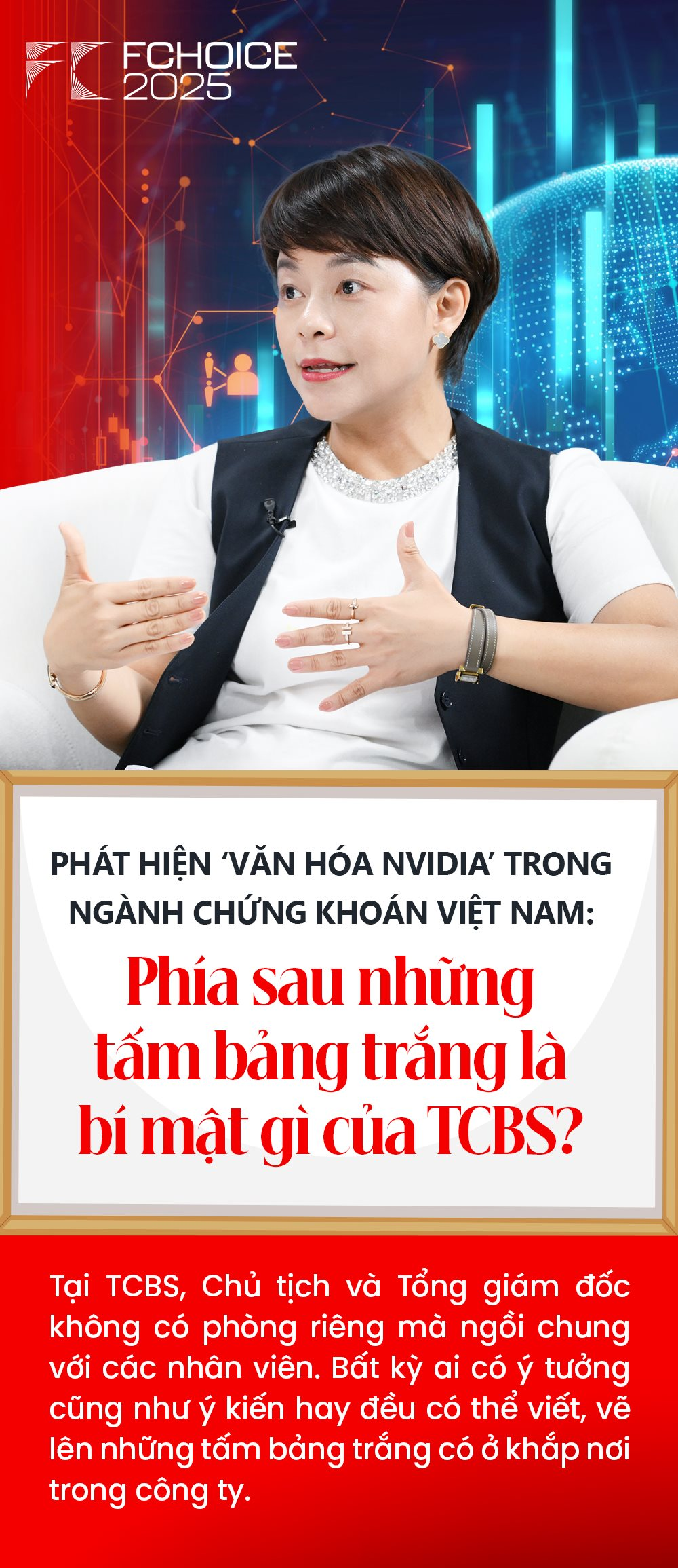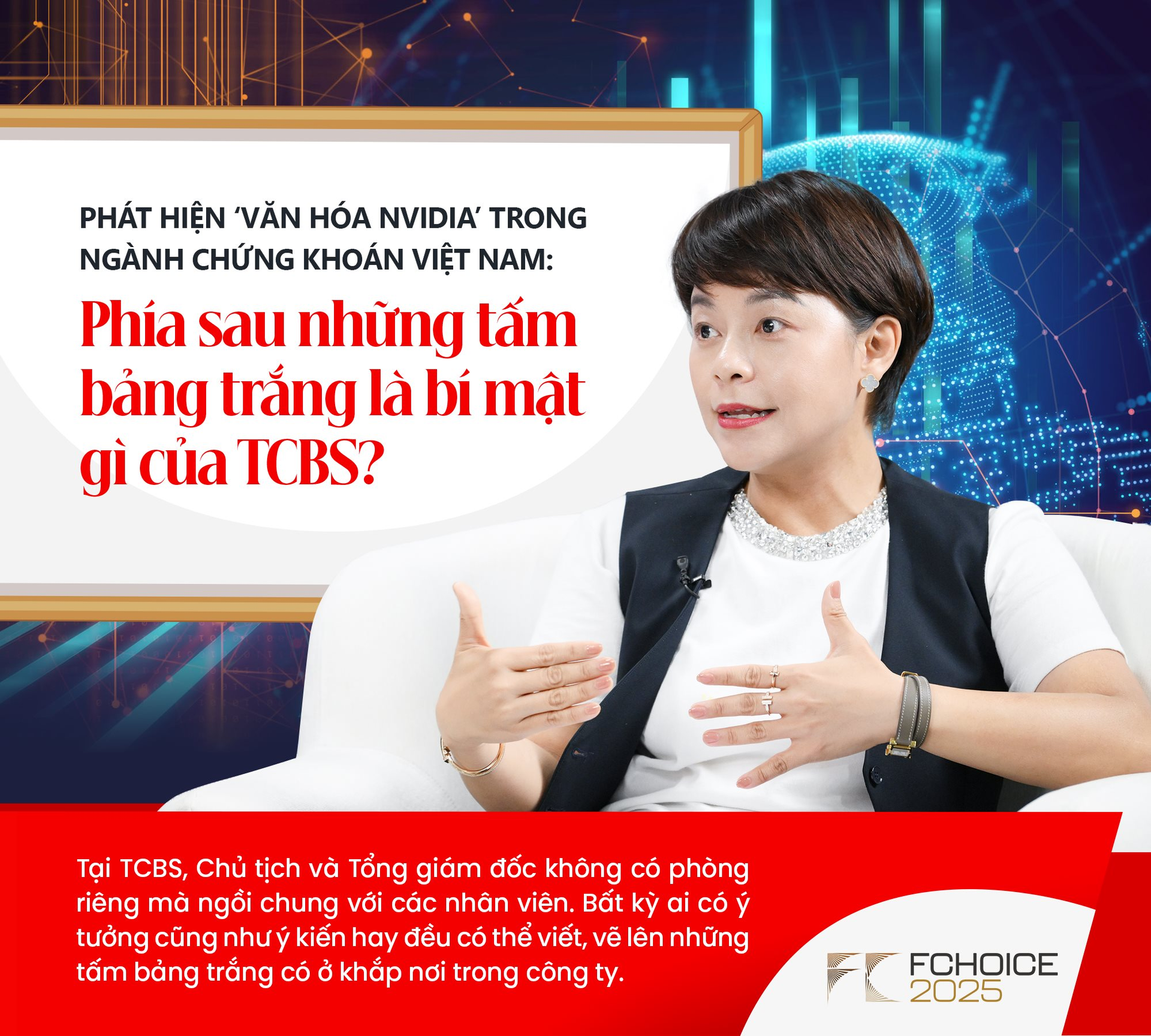 Tương tự như tấm bảng trắng, Chủ tịch HĐQT và CEO của công ty này không có phòng riêng mà ngồi chung với các nhân viên. Cả 2 người cũng vẽ lên bảng để chia sẻ, đóng góp ý kiến như những người khác. "Văn hoá bảng trắng" là nét tương đồng của TCBS và NVIDIA – tập đoàn công nghệ chip có giá trị nhất hành tinh. Cả 2 công ty đều dùng bảng trắng để phá bỏ rào cản cấp bậc, thúc đẩy khát khao học hỏi và sáng tạo tập thể.