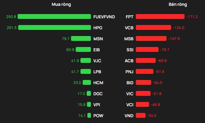 Tại chiều mua, cổ phiếu FUEVFVND được khối ngoại mua mạnh nhất trên HOSE với giá trị hơn 294 tỷ đồng. Theo sau, HPG và MSN là mã tiếp theo được gom mạnh 291 và 80 tỷ đồng.