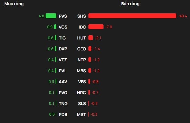 Chiều ngược lại, SHS là mã chịu áp lực bán ròng của khối ngoại với giá trị 41 tỷ đồng; theo sau IDC bị bán 7 tỷ, HUT, CEO, NTP bị bán từ vài tỷ đồng.