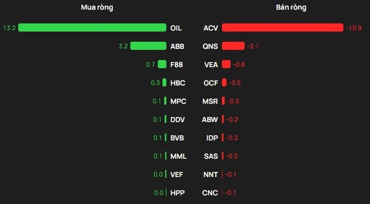 Chiều mua, cổ phiếu OIL được khối ngoại mua 13 tỷ đồng. Theo sau, ABB và F88 cũng được mua ròng mỗi mã vài trăm triệu đồng.