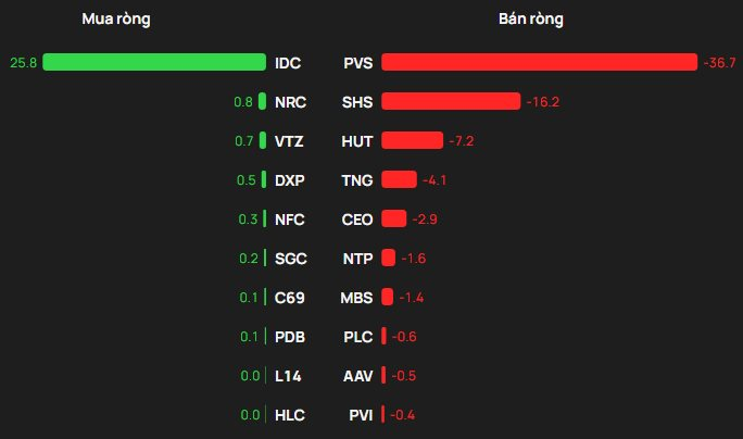 Tại chiều mua, IDC được mua ròng mạnh nhất với giá trị 26 tỷ đồng. Bên cạnh đó, NRC xếp tiếp theo trong sách mua ròng mạnh trên HNX với 0,8 tỷ đồng. Ngoài ra, khối ngoại cũng chi vài tỷ đồng để gom ròng VTZ, DXP, NFC.