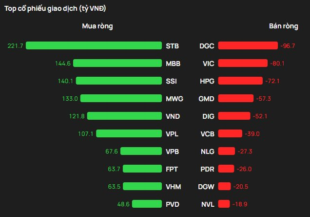 Tại chiều mua, cổ phiếu STB được khối ngoại mua mạnh nhất trên HOSE với giá trị hơn 221 tỷ đồng. Theo sau, MBB là mã tiếp theo được gom mạnh 145 tỷ đồng. Ngoài ra, SSI và MWG cũng được mua lần lượt 140 và 133 tỷ đồng.