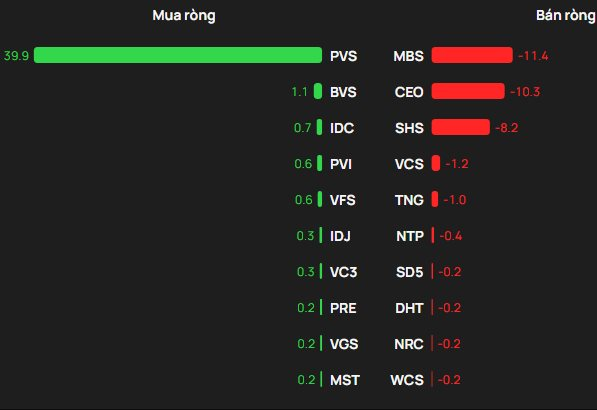 Tại chiều mua, PVS được mua ròng mạnh nhất với giá trị 40 tỷ đồng. Bên cạnh đó, BVS xếp tiếp theo trong sách mua ròng mạnh trên HNX với 1 tỷ đồng. Ngoài ra, khối ngoại cũng chi vài tỷ đồng để gom ròng IDC, PVI, VFS.