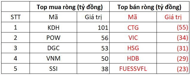 Giao dịch khối ngoại là điểm sáng khi họ mua ròng trên cả 3 sàn với tổng giá trị hơn 634 tỷ đồng. Lực mua của nhà đầu tư ngoại tập trung giải ngân vào KDH, POW cùng các cổ phiếu DGC, VNM trong khi bán ròng CTG, VIC.