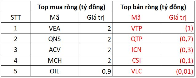 Cổ phiếu VEA hôm nay được khối ngoại mua ròng 2 tỷ đồng, tương tự, QNS, ACV, MCH cũng đồng loạt được mua ròng mỗi cổ phiếu 2 tỷ đồng.