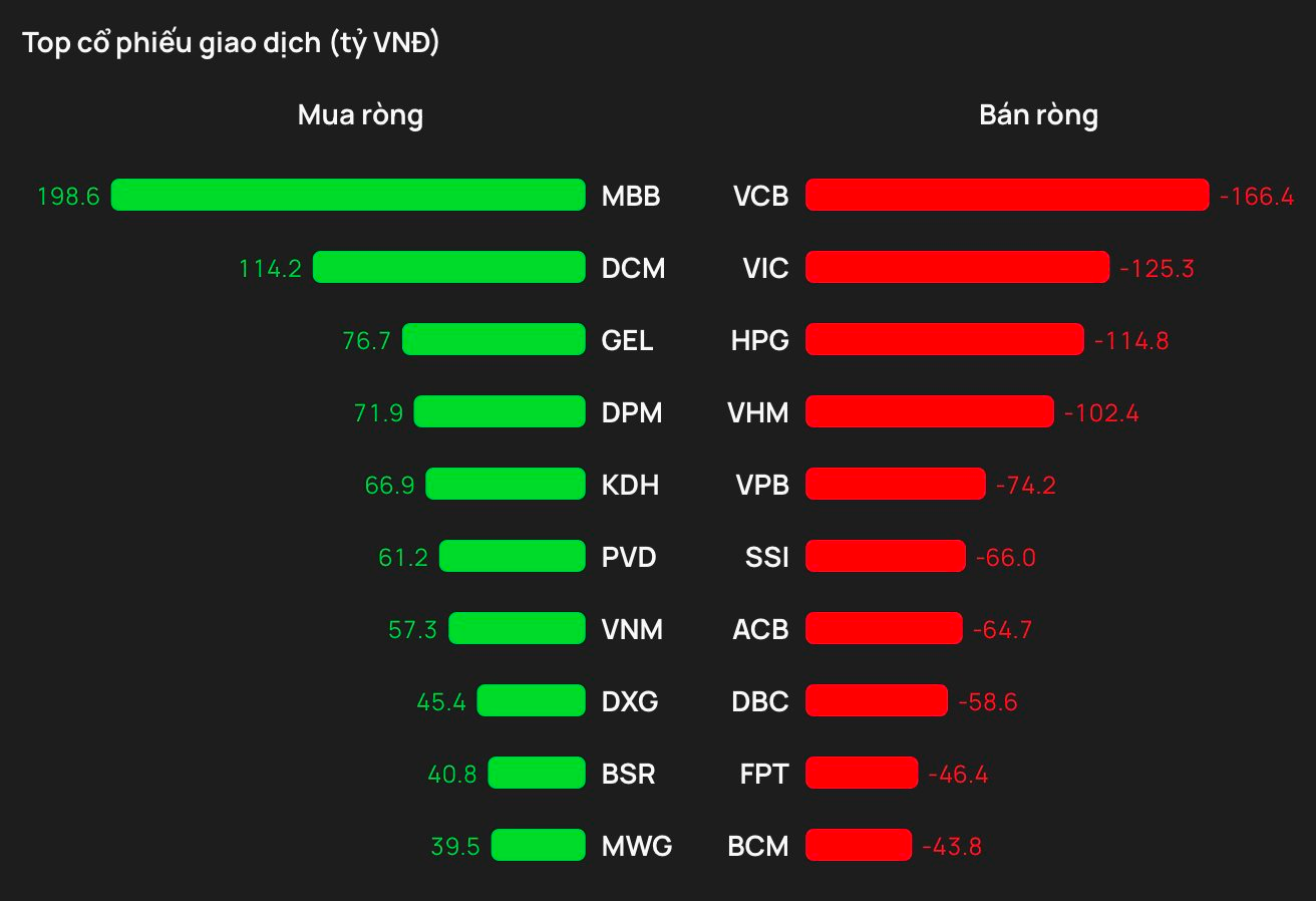 Tại chiều mua, cổ phiếu MBB được khối ngoại mua mạnh nhất trên HOSE với giá trị hơn 199 tỷ đồng. Theo sau, DCM và GEL là mã tiếp theo được gom mạnh 114 tỷ đồng và 77 tỷ đồng.