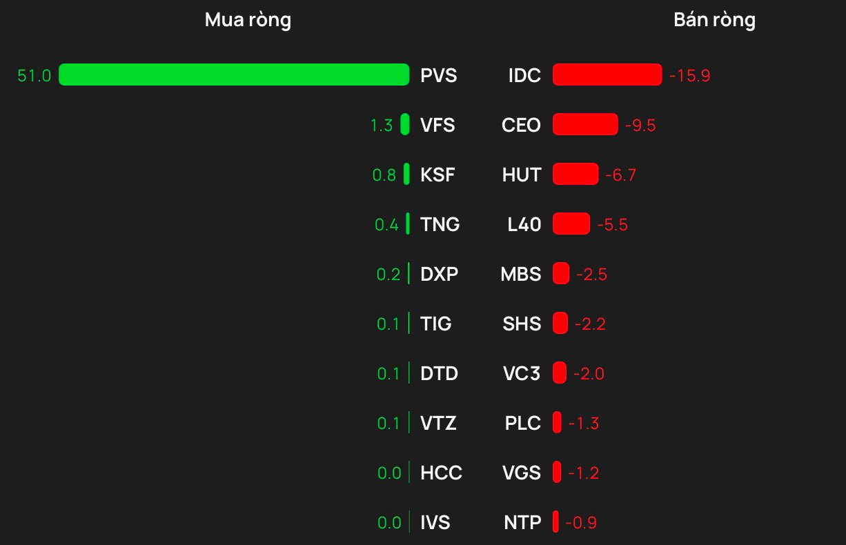 Tại chiều mua, PVS được mua ròng mạnh nhất với giá trị 51 tỷ đồng. Bên cạnh đó, VFS xếp tiếp theo trong sách mua ròng mạnh trên HNX với 1,3 tỷ đồng. Ngoài ra, khối ngoại cũng chi vài tỷ đồng để gom ròng VFS, KSF, TNG.