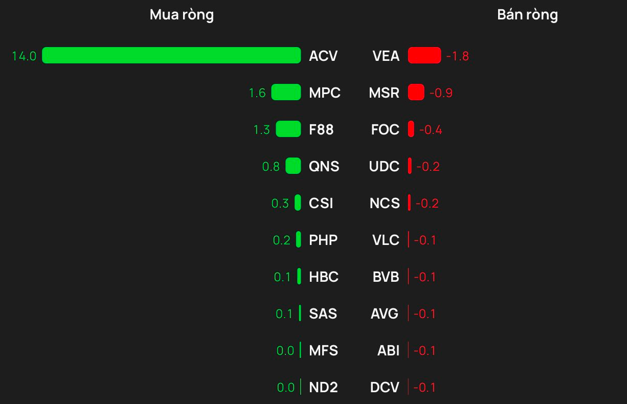 Chiều mua, cổ phiếu ACV được khối ngoại mua 14 tỷ đồng. Theo sau, MPC và F88 cũng được mua ròng mỗi mã vài trăm triệu đồng.