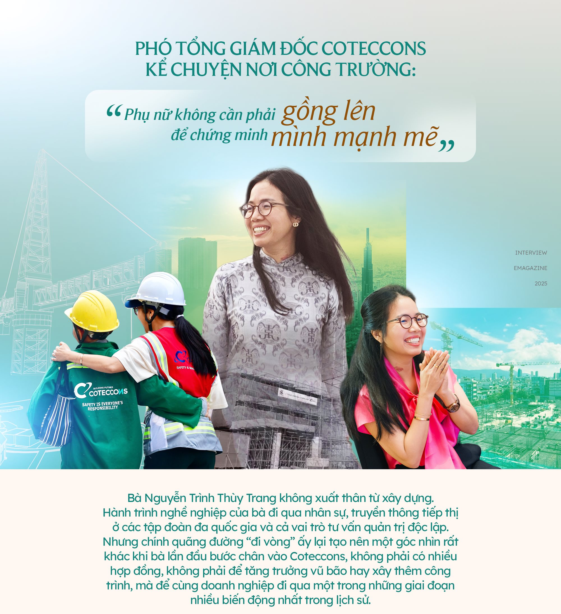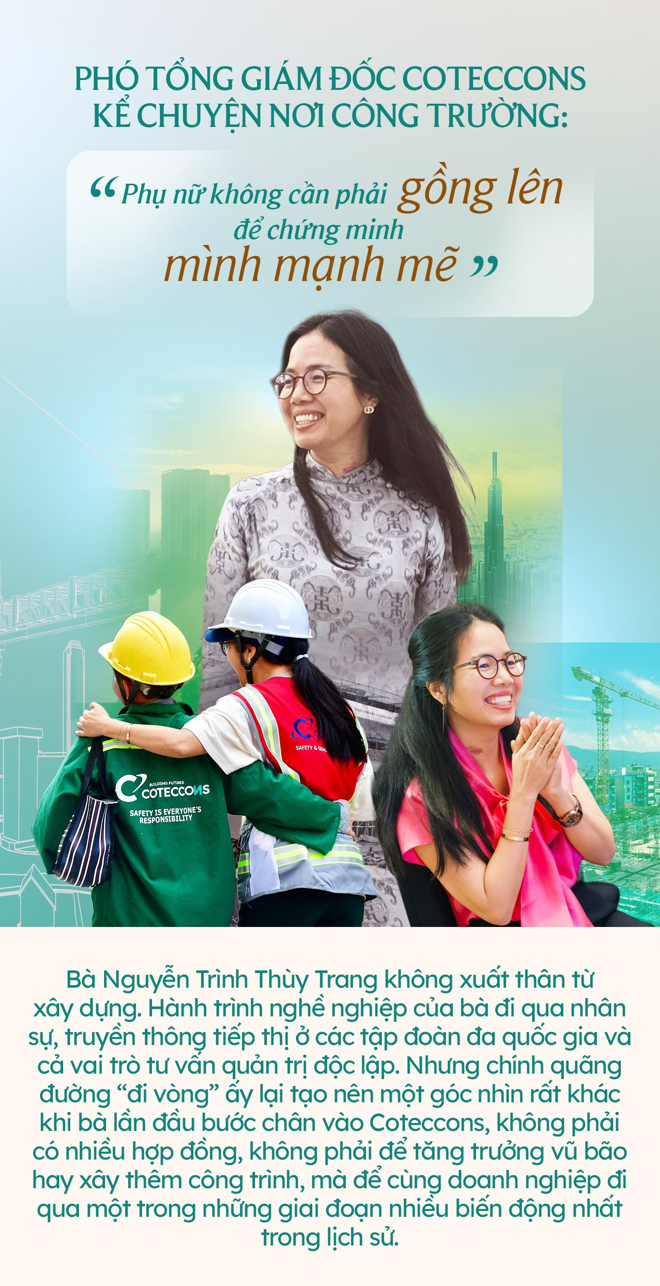 Với Phó Tổng giám đốc Khối vận hành Coteccons, một doanh nghiệp không chỉ là tổ chức kinh tế. Nó giống một con người, có thân, có trí và có tâm. Nếu thân là hệ thống vận hành và dự án, trí là năng lực chuyên môn, thì tâm chính là niềm tin, là văn hóa. Và khi niềm tin bị tổn thương và văn hóa vụn vỡ, mọi cấu trúc dù vững đến đâu cũng trở nên mong manh. Trong cuộc trò chuyện với chúng tôi nhân dịp 8/3, bà Nguyễn Trình Thùy Trang chia sẻ về hành trình nghề nghiệp trước khi đến với Coteccons, những giai đoạn biến động của doanh nghiệp này, cũng như cách bà nhìn nhận vai trò của phụ nữ trong ngành xây dựng.