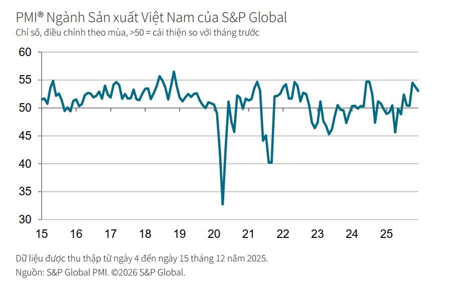 Theo đó, chỉ số Nhà Quản trị Mua hàng - Manufacturing Purchasing Managers' Index™ (PMI®) ngành sản xuất Việt Nam kết thúc năm 2025 với kết quả 53,0 điểm, giảm nhẹ so với mức 53,8 của tháng 11 nhưng vẫn nằm trên hẳn ngưỡng 50 điểm.