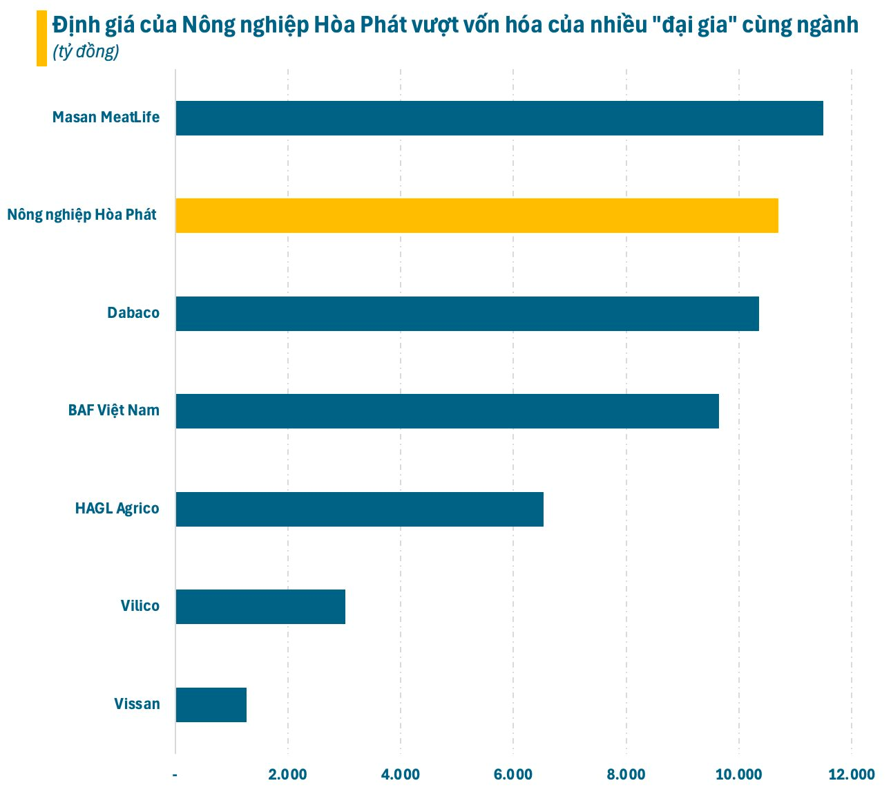 Con số này vượt qua vốn hóa của nhiều “đại gia” nông nghiệp trên sàn chứng khoán như Dabaco (DBC), BAF Việt Nam (BAF), HAGL Agrico (HNG), Vilico (VLC), Vissan (VSN)… và chỉ kém duy nhất Masan MeatLife (MML) trong ngành.