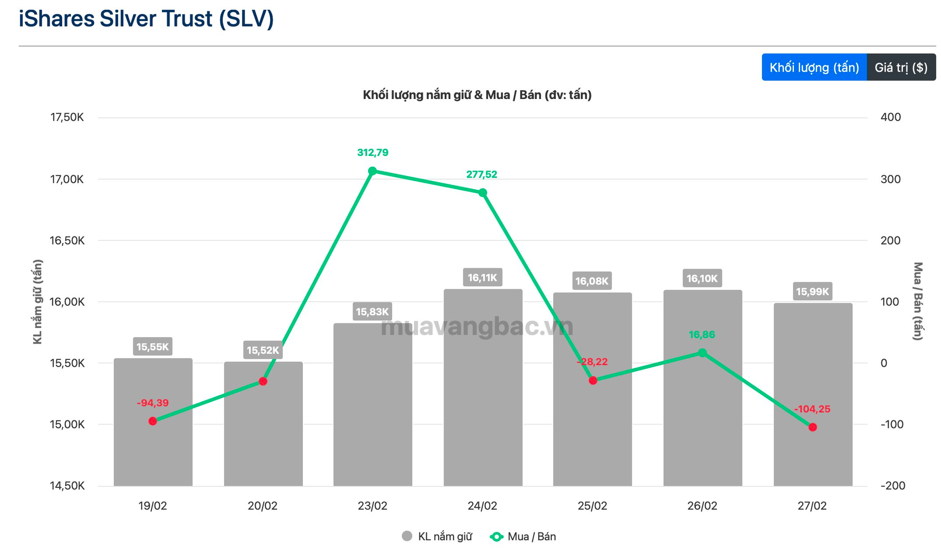 Giá bạc tăng vọt, quỹ bạc lớn nhất thế giới iShare Silver Trust (SLV) do BlackRock quản lý đã tranh thủ bán ra 104 tấn bạc trong ngày 27/2. Sau khi gom mạnh trong 2 ngày đầu tuần, lực mua của quỹ đã hạ nhiệt và đảo chiều sang bán. Tính đến cuối tháng 2, quỹ còn nắm gần 16.000 tấn bạc, tương đương quy mô khoảng hơn 46 tỷ USD.