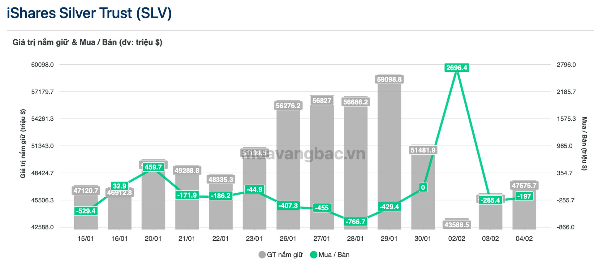 Sau phiên tung gần 3 tỷ USD bắt đáy đầu tháng 2, quỹ bạc lớn nhất thế giới iShare Silver Trust (SLV) đã quay đầu bán bớt trong 2 ngày liên tiếp. Tổng giá trị bán ra của quỹ vào khoảng gần 500 triệu USD (tương đương 130 tấn bạc). Tính đến ngày 4/2, SLV đang nắm gần 16.400 tấn bạc, quy mô tài sản khoảng 47,7 tỷ USD.