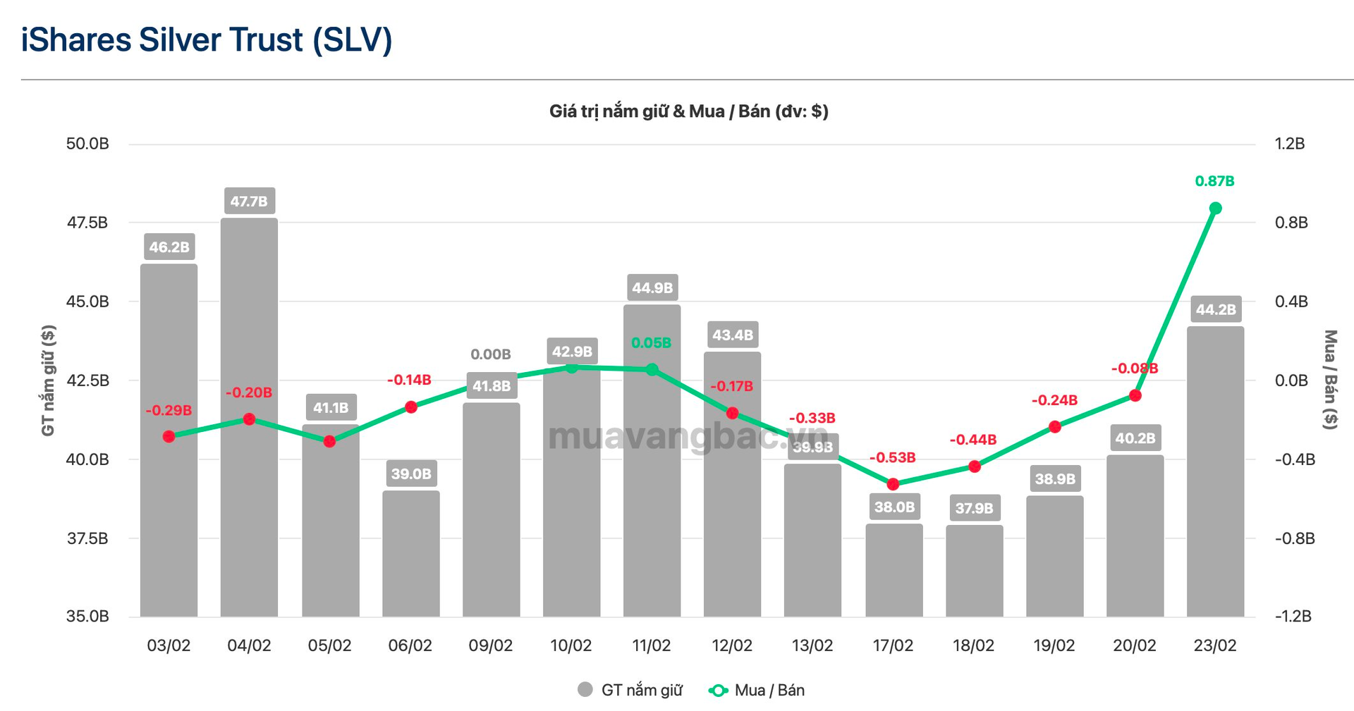 Theo dữ liệu cập nhật từ muavangbac.vn, iShare Silver Trust (SLV) do BlackRock quản lý vừa bất ngờ tung 870 triệu USD mua hơn 300 tấn bạc trong ngày 23/2. Đây là lượng mua ròng lớn nhất của quỹ kể từ đầu tháng 2. Động thái cũng chấm dứt chuỗi bán ròng 6 ngày liên tiếp.