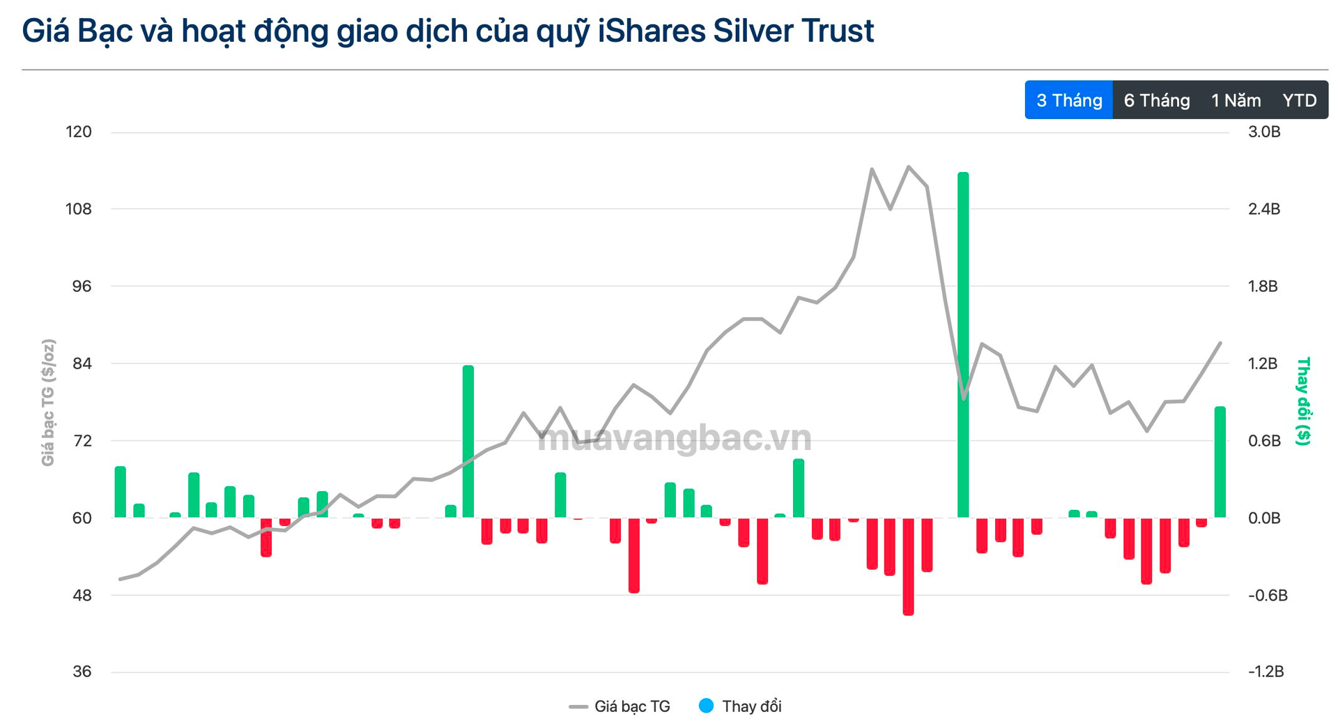 SLV bất ngờ mua mạnh trở lại trong bối cảnh giá bạc hồi phục mạnh lên trên mức 87 USD/oz, cao nhất kể từ đầu tháng. Tuy nhiên, so với mức đỉnh từng chạm đến trên 120 USD/oz hồi cuối tháng 1, giá bạc hiện thấp hơn khoảng 30%.