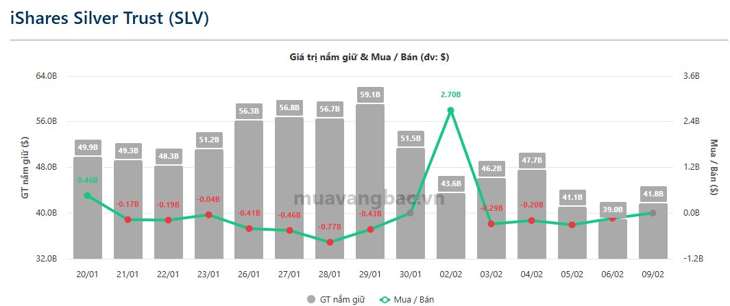 Theo cập nhật mới nhất từ muavangbac.vn, quỹ bạc lớn nhất thế giới iShare Silver Trust (SLV) đã ngừng bán ra trong ngày 9/2. Theo đó quỹ nắm giữ khoảng 16,2 nghìn tấn, giá trị khoảng 41,83 tỷ USD.
