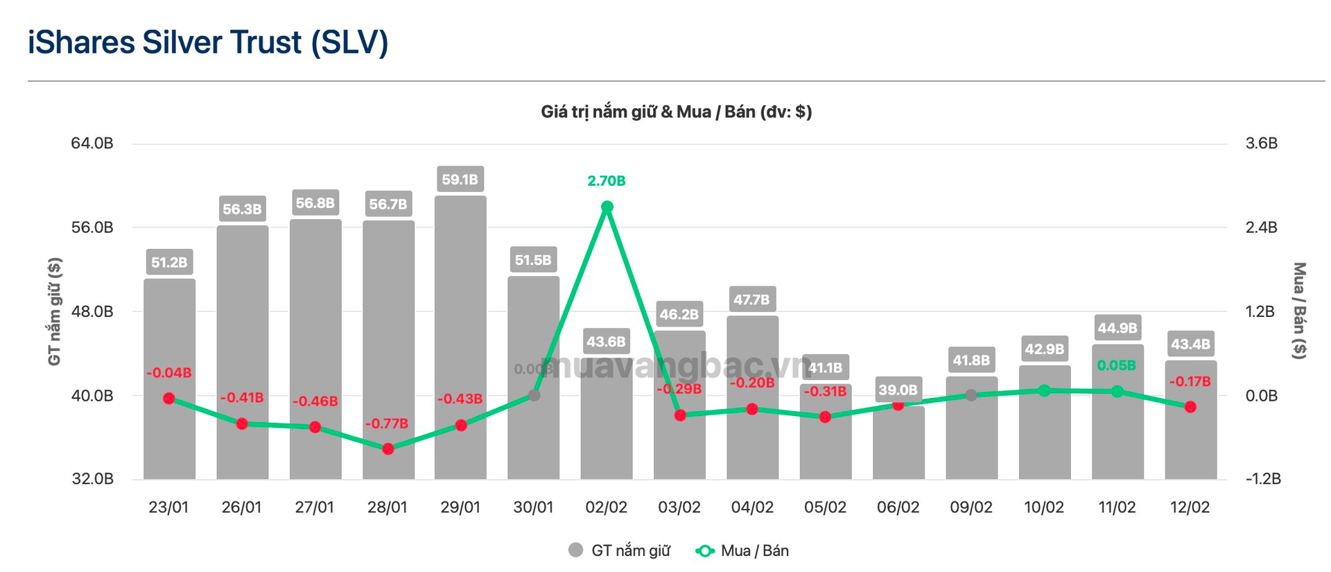 Theo dữ liệu từ muavangbac.vn, quỹ bạc iShare Silver Trust (SLV) đã quay xe bán ra trong phiên 12/2, với giá trị khoảng 170 triệu USD (tương 70 tấn bạc). Trước đó, quỹ đã mua vào 2 phiên liên tiếp. SLV hiện là quỹ bạc lớn nhất thế giới, nắm giữ hơn 16,6 nghìn tấn, quy mô tài sản khoảng 43,4 tỷ USD.