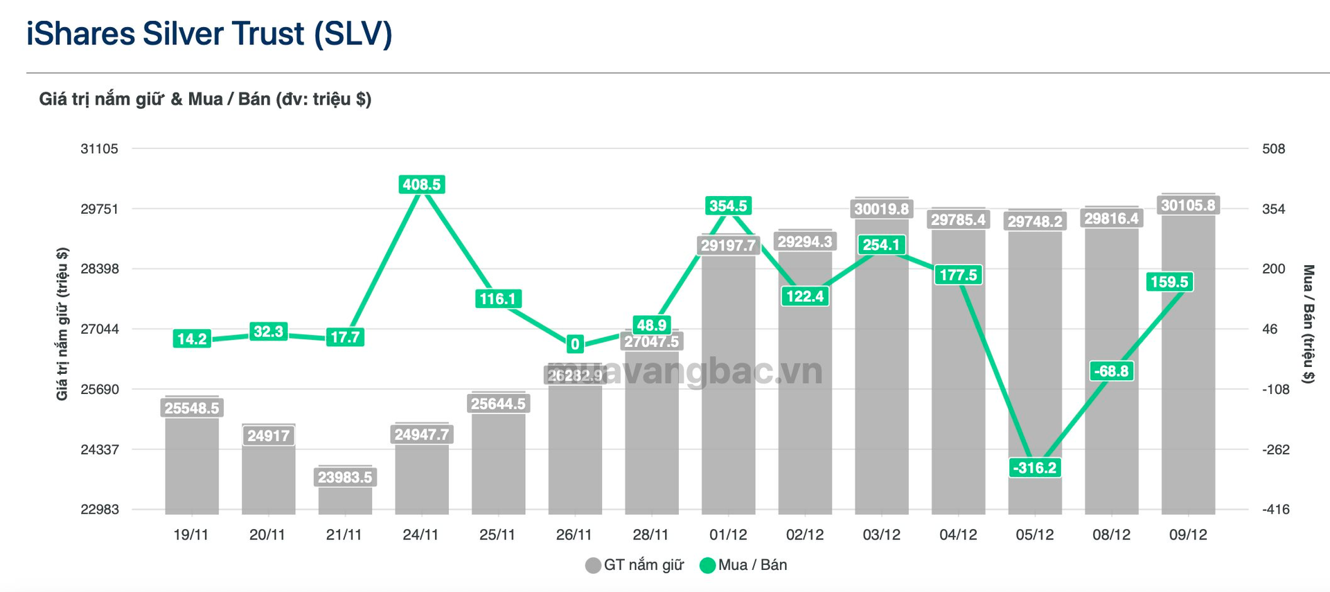 Trong khoảng thời gian này, iShare Silver Trust đã hút ròng lượng vốn kỷ lục, gần 2,3 tỷ USD để mua gần 50 triệu oz Bạc (1,6 nghìn tấn). Chỉ tính riêng từ đầu tháng 12 đến nay, quỹ đã hút hơn 500 triệu USD để mua thêm hơn 8 triệu oz Bạc (250 tấn).