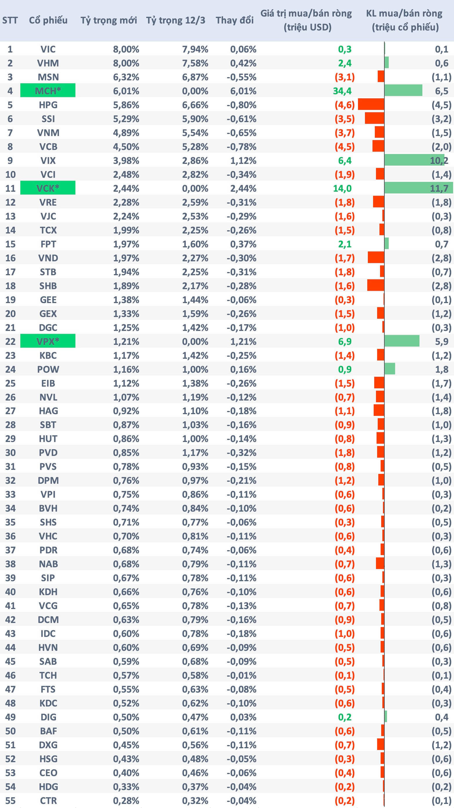 Tại ngày 12/3, quy mô danh mục VNM ETF đạt hơn 573 triệu USD (~15.000 tỷ đồng). Ước tính quỹ sẽ mua mới MCH (34,4 triệu USD – 6,5 triệu cp), VCK (14 triệu USD – 11,7 triệu cp), VPX (6,9 triệu USD – 5,9 triệu cp). Bên cạnh đó, quỹ sẽ mạnh tay mua thêm 1 cổ phiếu chứng khoán nữa là VIX (6,4 triệu USD – 10,2 triệu cp).