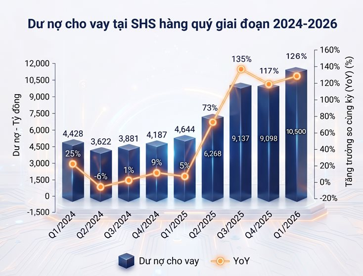 Tại thời điểm 31/3/2026, dư nợ cho vay của SHS ước đạt khoảng 10.502 tỷ đồng, tăng 15% so với đầu năm, và tăng mạnh 126% so với cùng kỳ quý 1/2025, đạt mức cao kỷ lục trong lịch sử hoạt động của SHS. Kết quả này phản ánh năng lực cấp vốn, quản trị rủi ro và khả năng mở rộng hoạt động khách hàng của SHS tiếp tục được nâng lên, qua đó duy trì tăng trưởng dư nợ ở mức tích cực.