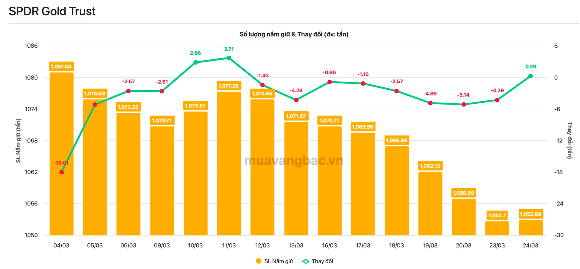 Theo cập nhật từ Muavangbac.vn, quỹ vàng lớn nhất thế giới SPDR Gold Trust vừa mua vào gần 3 tạ vàng trong ngày 24/3 qua đó chấm dứt chuỗi bán ròng kéo dài 8 phiên liên tiếp. Trước đó, gần 25 tấn vàng đã rời kho của tổ chức này trong chuỗi xả hàng vừa qua. Hiện tại, SPDR còn nắm hơn 1.050 tấn vàng.