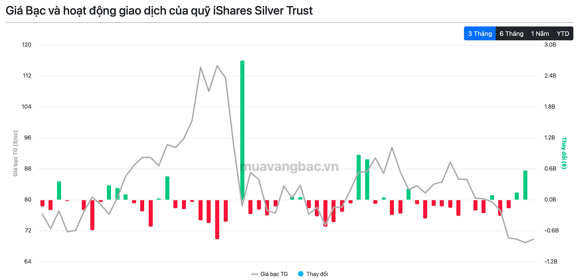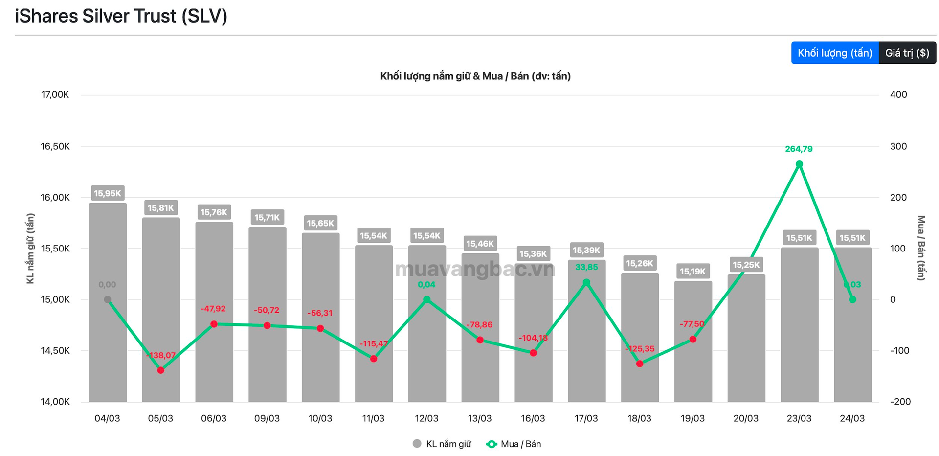 Trong khi đó, quỹ bạc lớn nhất thế giới iShare Silver Trust (SLV) cũng mua thêm bạc trong ngày 24/3 nhưng khối lượng rất nhỏ, gần như không đáng kể. Đây là ngày thứ 3 liên tiếp SLV mua ròng. Trước đó, quỹ đã mua vào hơn 300 tấn bạc chỉ trong 2 ngày 20-23/3. Động thái đẩy tổng lượng bạc do SLV nắm giữ lên trên 15.500 tấn.