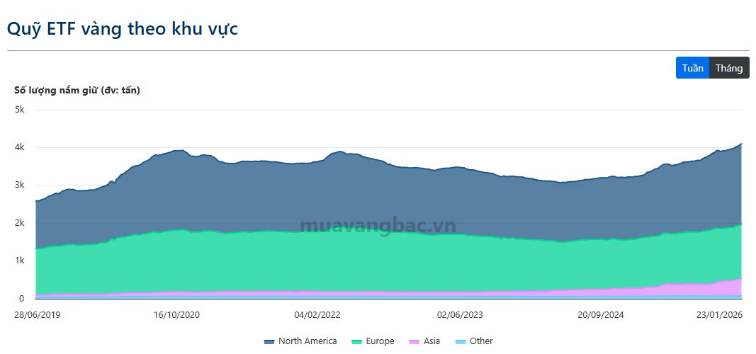 Xét theo khu vực, các quỹ đến từ Bắc Mỹ và Châu Âu vẫn nắm nhiều vàng nhất với khối lượng lần lượt trên mức 2.100 tấn và 1.400 tấn. Tuy nhiên, các quỹ Châu Á cũng đang nổi lên trở thành “tay chơi” đáng gờm khi liên tục mua mạnh để nâng tổng lượng vàng nắm giữ lên gấp đôi thời điểm đầu năm ngoái, hiện đạt gần 460 tấn.