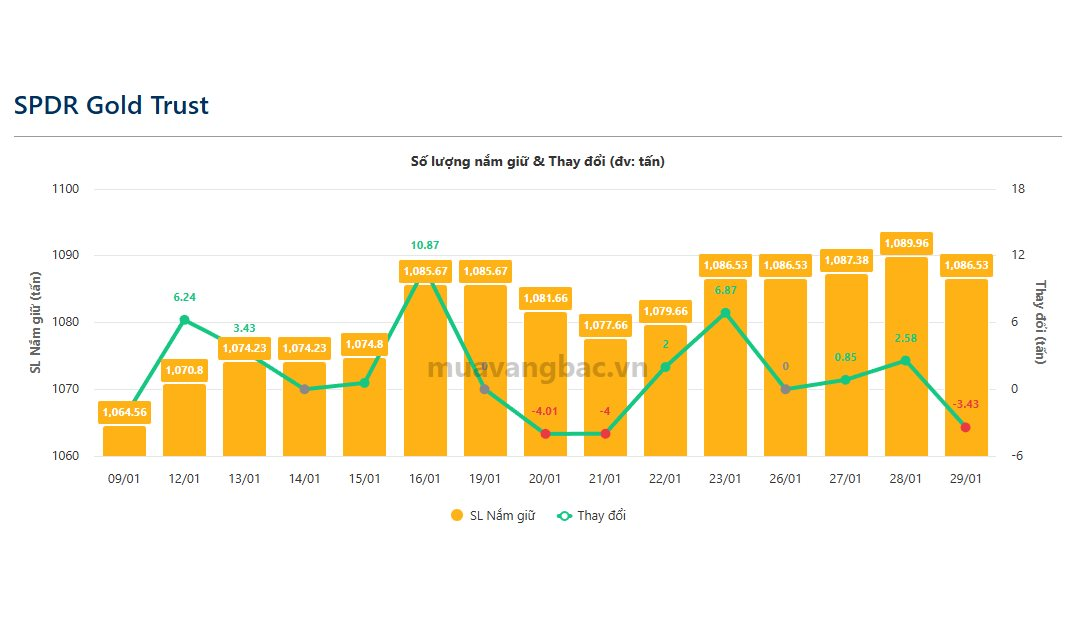 Theo dữ liệu thống kê mới nhất từ Muavangbac.vn, quỹ vàng lớn nhất thế giới SPDR Gold Shares đã bất ngờ bán ra 3,43 tấn vàng (560 triệu USD) trong phiên 29/1, chấm dứt xu hướng gom thêm của quỹ vàng này trong 1 tuần trước đó. Hiện tại, SPDR Gold Share còn nắm giữ khoảng 1.096,53 tấn vàng.